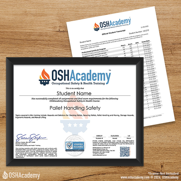 As an OSHAcademy student, you have free access to all our training materials, including knowledge checks and course activities. Documentation of your training–such as exam scores, certificates, and transcripts–can be accessed by purchasing a certificate package.