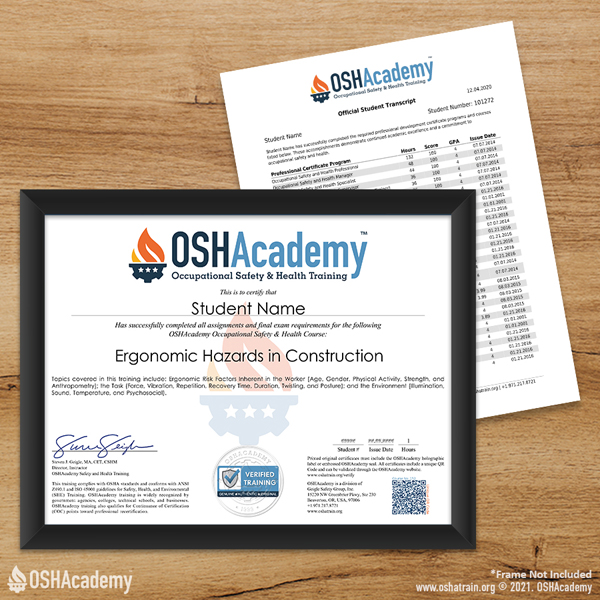 As an OSHAcademy student, you have free access to all our training materials, including knowledge checks and course activities. Documentation of your training–such as exam scores, certificates, and transcripts–can be accessed by purchasing a certificate package.