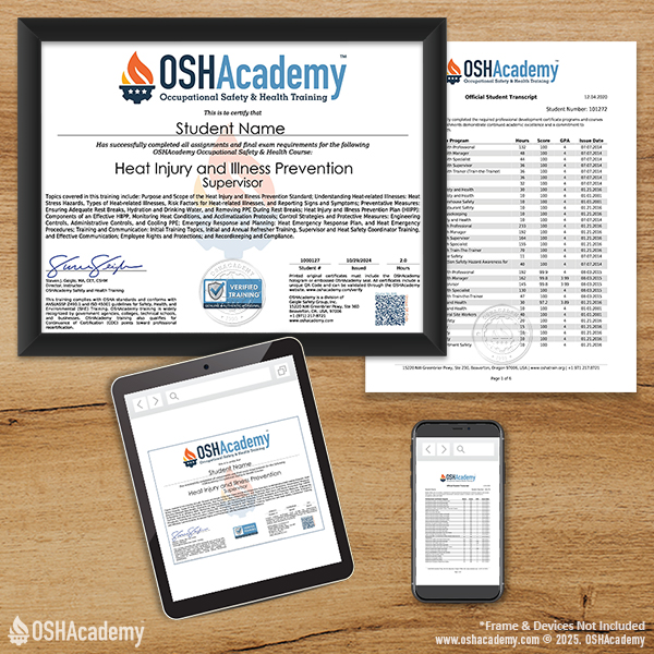 As an OSHAcademy student, you have free access to all our training materials, including knowledge checks and course activities. Documentation of your training–such as exam scores, certificates, and transcripts–can be accessed by purchasing a certificate package.