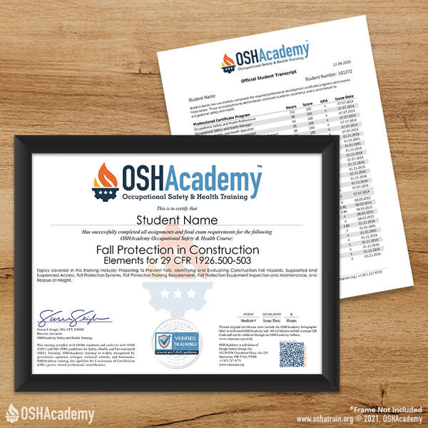 As an OSHAcademy student, you have free access to all our training materials, including knowledge checks and course activities. Documentation of your training–such as exam scores, certificates, and transcripts–can be accessed by purchasing a certificate package.